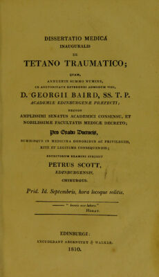 Dissertatio medica inauguralis de tetano traumatico; ... / Petrus Scott.
