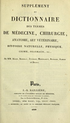 Dictionnaire des termes de medecine, chirurgie, anatomie, art veterinaire, pharmacie, histoire naturelle, physique, chimie, etc., augmente d'un supplement dans lequel sont compris les nouveaux termes introduits dans le langage des sciences medicales... / par Bégin et al.