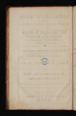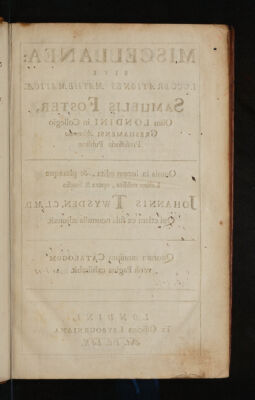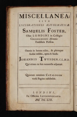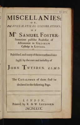 Miscellanies: or, mathematical lucubrations / Of Mr. Samuel Foster, sometime public professor of astronomie in Gresham colledge in London. Published, and many of them translated into English, by the care and industry of John Twysden. [In Latin and English] C.L.M.D. Whereunto he hath annexed some things of his own. The catalogue of all which the following page will shew.