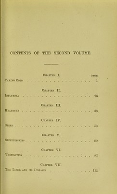 ![CONTENTS OF THE SECOND VOLUME. Taking Cold . . Chapter I. page Influenza . . . Chapter II. Headache . . . Chapter III. .38 Sleep Chapter IV. Sleeplessness . . Chapter V. Ventilation . . Chapter VI. Chapter VII. The Liver and its Diseases 1]3](https://iiif.wellcomecollection.org/image/b2807290x_0002_0011.jp2/full/800%2C/0/default.jpg)