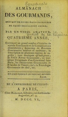 Almanach des gourmands, servant de guide dans les moyens de faire excellente cheŕe / par un vieil amateur.
