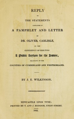 Reply to the statements contained in a pamphlet and letter by Dr. Oliver, Carlisle, on the expediency of erecting a public asylum for the insane : belonging to the counties of Cumberland and Westmorland.