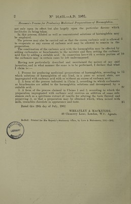 ![A.B. 1902 16,855 Date of Application, 29th July, 1902-~Accepted, 76lh Oct., 7902 20 COMPLETE SPECIFICATIOjSL Process for Producing Medicinal Preparations of Haemoglobin, I, litiEDiiicii Ha’stSvSEN, x\.potliecary, of Altoiia, on tlie Elbe, in the Empire of Ijeiman^, do hereby declare the nature of this invention and in what manner the same is to be performed to be particulaidy described and ascertained in and by the followino' statement: — '■> Ihe haemoglobin of the blood and blood free from fil)rin have already been utilised for producing blood-forming liquid prer)a]’ations. As the blood and the haemog-lobin easily become decomposed and moreover have a decidedly unpleasant taste, attempts have been made to preserve the liquid preparations made therefrom by adding thereto a somewhat considerable quantitv of glycerine and to remove ^ 3 ^ tic n of wine, especially Malaga wine. Glycerine, however, is not a neutral substance; it is indigestible and irritates the mucuous membrane, bor this reason alone, it is not suitable for a liquid medical prepara¬ tion given to patients in large doses. The wine added moreover only incompletely removes the taste of blood and, in consequence of its acid reaction, increases the lo taste of iron in the haemoglobin. Apart from this, the sugar contained in the wine easily causes decomuosition of the haemoglobin. t * By means of the present process a much more perfect haemoglobin preparation is obtained in both respects, by reason of the haemoglobin being converted into carbonated haemoglobin by the introduction of carbonic acid. The applicant has found that haemoglebin can be more easily ])reserved from decoiiqiositioii when combined with carbonic acid and that the taste of blood belonyino- tliereio is considerably lessened and can be entirely removed by the suitable addition of aromatic substances. The process consists generally in mixing haemoglobin of anv kind with car¬ bonic acid. In such case the carbonic acid combines with the haemoglobin and the solution is mixed for instance with a spirituous extract of spice, brandy or the like. In this process the haemoglobin or the haemoglobin solution may be mixed with any preferred liquids or other sul)stances either before or after being com¬ bined with the carbonic acid. The only imj)ortant point is that the haemoglobin and the carbonic acid shall come into contact and be enal)led to combine together. Jilood free of fibrin may also be mixed with carbonic acid and be employed for ])roducing blood preparations containing the new carbonated haemoglobin. Eurther, Hie serum may be partially eliminated from the blood or the haenioglobiii more or less completely separated from the seruin and the haemoglobin ihus obtained be dissolved in water or a liquid containing water and then be mixed with the carbonic acid. It is not possible to enumerate all the different ways of carrying out tln^ ])rocess. It mav, however be es'i)ecially observed that tlie prejiaration can^ be mixed with milk. ' It is in fact, very advisable to administer the preparation mixed^ with milk.' This mixture with milk is of a colour resembling chocolate. If suiitable spices be used (especially vanilla in the form of a spirituous extract) a beverage is obtained which has e'xactly the colour and taste of chocolate. It is obvious 15 that this is an important advantage in medicinal preparations compared with the blood preparations hitherto known, as the valuo of a medicinal preparation depends (Price 8f?.] 2b do do 40](https://iiif.wellcomecollection.org/image/b30737576_0001.jp2/full/800%2C/0/default.jpg)
