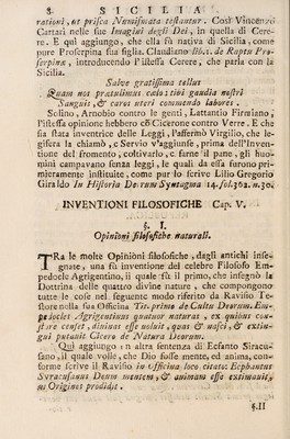 ![P^cra la Dèa-fruttìfera, e raccolto ■ Dì Cerere il frumentoè diti’Egitto Io detta con le corna. » Diodoro adunque nel libro fello parlando del primo ritrovamento dell’ufo del frumento in Sicilia da Cerere accennato, dice quelle parole: ove parla della protetto¬ ne della Sicilia tutta fiotto la Dea Cerere , e Prole rp in a, fua figliuola *X raduni Siculi ducla ex antiqua a proge¬ nitori ous fama Siciliani Cereri, ac P r oferp inò fa era u effe . Has jimul Deas primura in Sicilia vijas , inque ea primo fr urne mura terr# ho ni tate or tura : f cut & clarij- Jìraus te fatar P oeta\ inquìes ora ni a ibi fua sponte terrà pro¬ ducete * In agro Le omino, multifque pr mere a Sitili ò hcis% etiara nane triticura ugrtfe oriti » E conchiude poibia nel fine » Denìque fi queeritur ante frumenti ùfura , ubi primari id re per tura ji /y me r ito ejus rei laus Siti tiò tri- bueretur, Ed il mede imo Diodoro replicando P iftéf- fo nel libro fello confermò : Horaims , qui eara grati fufceperuut , tanquarn benefica memorerà frumenti e- docuiffe ufura , in queis primi propter fuam erga Deam huraanìtciterà pof Siculos fuere Atkenienfes . ] Onde da tutti i Siciliani in honor di Cerere, e Proierpina, furo¬ no inftituiti facrificii? e folenniilime felle, e cerimonie per haver ella ritrovato un’invelinone tant’ utile , e necefia- ria all’humano foftenta mento ; onde foggiunfe Diodoro: At Siculi Cererii9 Proferpinòque erga eos ìndulgentia moti > ut qui bus frumenti ufus pi ira afa innovilifiet, atri- que e avara fiera cerimonia] que diverfo anni tempore in- fituere p Di quell’ inventione di Cerere ne fa mentane Cicerone neli’attione quinta contro Verte lìb* 4. O/7//.9. ©ve dice : P/etus eji hòc opinibj J/Mices, qua confai ex antiq uìjfmis Grò cor urti htteris, atque rnonuraentìs Infu- farà Siti ti ara tot ara effe Cereri, & Libera Corifee? at dm • pi oc cura c&terò gentes pie arbitrantur , tura ipps Sicuhs tara per fu afura e[l, ut unirais e epura taf tura, atque in- natura effe vi de ut tir « /Vara y& natas effe has in bis lo- cis Utas-i & fruges in e a terra primura repertas arbitran¬ tur • Da qui ne venne quel celebre proverbio appretto A a gli](https://iiif.wellcomecollection.org/image/b30518659_0019.jp2/full/800%2C/0/default.jpg)
