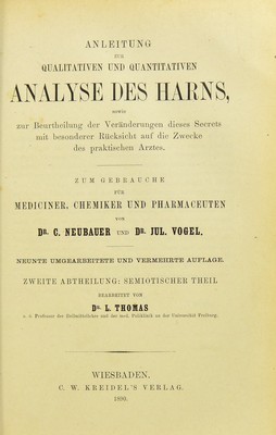Anleitung zur qualitativen und quantitativen Analyse des Harns : sowie zur Beurtheilung der Veränderungen dieses Secrets mit besonderer Rücksicht auf die Zwecke des praktischen Arztes zum Gebrauche für Mediciner, Chemiker und Pharmaceuten / von C. Neubauer und Jul. Vogel.