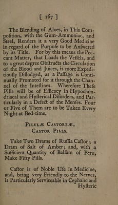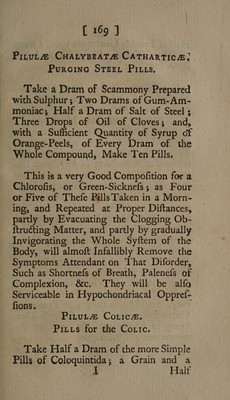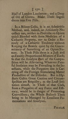 ![tn] and Cloves, of Each Two Drops ; and, with “a Sufficient Quantity of Syrup of Orange-Peels, of Every Dram of the Whole Compofition Make Ten Pills. Thefe Pills, from their Warming and Attenuating Property, are Effectually Calculated for Anfwering the Purpofe Specified by their Title. Nor will They only be of Service on That Occafion, but likewife in All Hyfterical Complaints in general. And, as there isa Great Ana- logy between Thefe and Diforders of the Spleen, They would be alfo very Properly Adminiftred to Hypochondriacal Perfons. In regard of the Menfes, Three of them are to be Taken twice a day for Three or Four Days before the Ufual Time of their Appearance ; and in Other Cafes the Ufe of them may be continued for Several Weeks together. PiLvLz de GuarAco. Gualacum PILts. - Take Gum Guaiacum and Aloes, of . Each a Dram and a Half; and, with a Sufficient Quantity of Balfam of Peru, Make Them into Pills, — Py Three](https://iiif.wellcomecollection.org/image/b33008164_0186.jp2/full/800%2C/0/default.jpg)