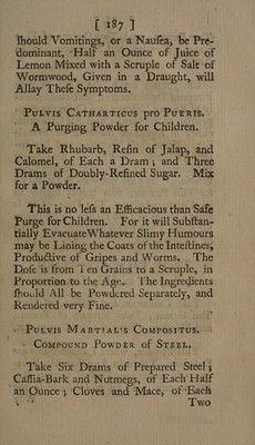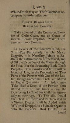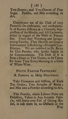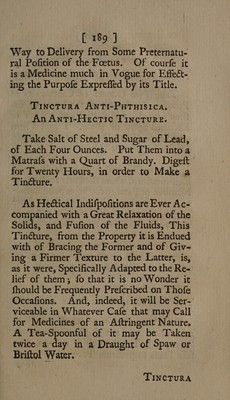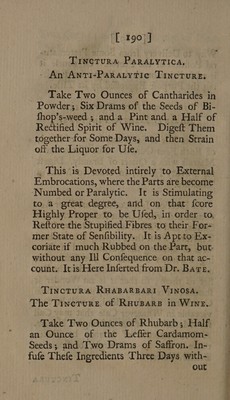 ![Ll 1991] TiNcTURA PARALYTICA, An Anti-Paratytic Tincture. Take Two Ounces of Cantharides in Powder; Six Drams of the Seeds of Bi- fhop’ auueed ; anda Pint and. a Half of Rectified Spirit of Wine. Digeft Them . together-for Some Days, and Hen ertain ofr. the Liquor for Ute. . This is Dostoisd intirely to External Embrocations, where the Parts are become Numbed or Paralytic. It is Stimulating to a great degree, arid on that fcore Highly Proper to be Ufed, in order. to. Rettore the Stupified Fibres to their For- mer State of Senfibility. It is Aptto Ex- coriate if much Rubbed on the Part, but. without any Ill Confequence on. that ac- count. Itis Here Inferted from Dr. Bare, TinctuRA RHABARBARI VINOSA. The Tineture of Ruvuspars in WiNE.. Take Two Ounces of Rhubarb ; Half. an Ounce of the Leffer Cardamom- Seeds; and I'wo Drams of Saffron. In- fufe Thefe Ingredients Three Days with-. out](https://iiif.wellcomecollection.org/image/b33008164_0204.jp2/full/800%2C/0/default.jpg)