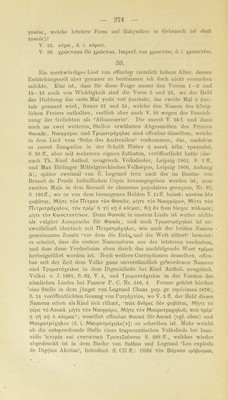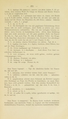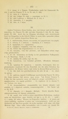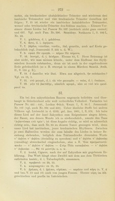 ![270 V. 1. ö M^covxac: über dicbeu Namen des Schiffeis weiss ich keine Auskunl't zu gehen; ein Nachweis darüber würde vielleicht die chrono- logische Fixirung des Liedes ermöglichen, — toö Meja, Genet. des wie ein Eigenname behandelten Titels ö Mdfac (wogegen geYdXou Genet. der gewöhnlichen neugriechischen Form des Adjectivs, nefäXoc, sein würde). V. 2. n6Xi für TTöXic. V. 4. dirapdcKuiiJe: irapacKÜttTcu es Irersehen beim Siebbücken, sich falsch verbeugen. Vgl. inapatt&Tr]ca 29, 6 und 30, 5. V. 5. ßaciXunc: zu 29, 14. V. 9. Tö ßoXexö c’ (d. i. cou) kann nichts andres bedeuten als ^dein Wunsch, Wüle’. Sonst ist ßoXexö Synonymum von öuvaxöv oder von eÜKttipov. Vgl. Korais 'AxaKxa IV, 1, S. 56 und 57 (der es von ßoXrj, ßdXXm ableitet) und Jeannaraki S. 326 u. d. W. V. 10. x^’iöeiievoc für xdibeugevoc. V. 11. KdXi'ria, d. i. Schuhe, in der mittelalterlichen Graecität häufig (vgl. Du Gange S. 549 f.), in der heutigen Volksspraehe meines Wissens nicht mehr üblich, ist nicht mit Korais 'AxoKxa I, S. 169 und IV, 2, S. 600 von lat. calceus, sondern vielmehr unmittelbar von lat. caliga abzuleiten. Vom Subst. KaXiyi ist wiederum das auch im heuti- gen Griechisch noch ganz gebräuchliche Verb koXituivui, d. i. beschla- gen (s. 55, 3), gebildet. — cpöpie, d. i. eepdpee, Imperf. von qx>püj. V. 12. yöpoc Tc-fj TioöoüXac (ixoboOXa und Tio&ioöXa, DeminuL von irobid): vgl. zu 53, 15. Zu ergänzen ist elvai (xexoioc), d. h. dpKei. V. 14. Xec, d. i. Xeyeic. V. 15. cxdpvei: cxepvui für cxdXvui, d. i. cxeXXui. V. 24. Zum Gedanken vgl. die Lieder bei Passow Nr. 526, 1—4 und NeoeXX. ’AvdX'. I, S. 343, sowie Hahu’s Gr. Märchen U, S. 148 oben. — irXaKÖ: TrXaKÖc, Hürde, Pferch für Thiere, vielleicht verwandt mit uXaS, soll jetzt haujitsächlich in Makedonien gebräuchlich sein (das gemeingriechische Wort dafür ist pdvöpa). V. 26. dvabe^ijuiaic (dvabexopai), die von ihr aus der Taufe ge- hobenen Mädchen (auch bei Pass. Nr. 526, 13). Unten V. 57 statt des- sen TTapabeSi|Lua(c, wohl um einen unangenehmen Hiatus zu ver- meiden. V. 27. xPiJtOKepapu)|Li4vo, ergänze elvai. V. 28. dXXr|vf)C für dXXrjc. Vgl. Mullach S. 197 flF. M. Deffuer Neogr. S. 87. — xö cnixi xi^c: das Pronomen abuudirt Ganz ähnlich sagt unser Volk: ^der andren ihr Haus’. V. 29. Keivfjc und ^Keivfic für ^xeivric. Vgl. Mullach S. 199. — Xoydpi: zu 35, 2. V. 30. cdpvei, d. i. cOpei. V. 31. Kuicxavxd für Kmvcxavxd, d. i. Kujvcxavxlvov. — dnavrai- vouv: dTTavxaivu), Nebenform von dnavxduj. Ebenso V. 45. V. 33. CKupiKia für cxapiKia (vgl. cKOivi für cxoivi, CKoXeiö für cxoXeiö, d. i. cxoXeiov, ckivoc für exivoe, dpocKuXr) oben 57, 23 für pacxdXrj), d. i. cuTX«pii<ia, bezeichnet sowohl das Geschenk, das zum Danke für eine erhaltene frohe Botschaft gegeben wird, als auch die](https://iiif.wellcomecollection.org/image/b24873329_0282.jp2/full/800%2C/0/default.jpg)