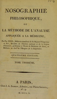 Nosographie philosophique, ou la méthode de l'analyse appliquée à la médecine / Par Ph. Pinel.