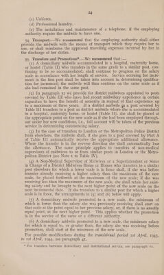 ![from the actual supervision of the midwives, their duties include the organisa- tion of the domiciliary midwifery service and often other functions directly concerned with the midwifery service. We recommend, therefore, that the salary of a Non-Medical Supervisor of Midwives, within the range suggested, shall not be assessed on the number of midwives supervised, but that the employing authority shall fix the scale with due regard to the various duties of the office. The scale so fixed should, in our view, always be set out when the post is advertised. The range we recommend is intended to apply not only to Non-Medical Supervisors of Midwives employed whole-time as such, but also to those who combine the post with other duties. The Departmental Committee on the Training and Employment of Midwives (to which reference is made in para- graph 8), while recognising that in certain cases the duties of Non-Medical Supervisor of Midwives might be combined with other duties such as those of Superintendent of a County Nursing Association, expressed the view that it was desirable for ad hoc officers to be appointed to these positions by Local Supervising Authorities. We do not refer specially in the paragraphs in this Section which deal with conditions of service to the conditions of service of Non-Medical Supervisors of Midwives, but we intend that our recommendations as to conditions of domiciliary midwives should apply, where appropriate, to Non-Medical Super- visors. If, for example, a Non-Medical Supervisor is required to wear uniform, the employing authority should provide the uniform or reimburse reasonable expenses incurred by the Supervisor in providing it. Similarly, if they require her to have a telephone they should pay for its installation and maintenance. They should also provide her with the means of transport which they require her to use or reimburse approved travelling expenses incurred in the discharge of her duties. She will be entitled to 28 days annual leave with pay a year, and the prescribed amount of sick leave. TABLE II-—-SaLaRIEs AND EMOLUMENTS OF DOoMICILIARY MIDWIVES PROVIDED WITH FULL EMOLUMENTS IN HOSPITAL, MATERNITY HOME oR HOSTEL. Total value of Total value of Recommended Annual Annual Salary & Post Salary (exclusive Emoluments. Emoluments of emoluments) (For [Col. 2 plus superannuation Col. 3] purposes). (1) (2) (3) (4) Superintendent in Charge* of a District Midwives Home or Homes. If the number of mid- wives (apart from pupils is) :— (i)-20 or over .:: ... | £250, rising by annual £120 £370-£450 increments of {20 to p) £330. (ii) 15-19 xe ... | £240, rising by annual £120 £3600-£435 increments of £15 to - £315. (iii) 10-14 ios ... | £230, rising by annual £120 £350-£425 increments of £15 to £305. * For definition of Superintendent or Sister-in-Charge of a District Midwives Home see paragraph 31. For those in charge of a District Midwives Home attached to a hospital see Note 1 to Table I.](https://iiif.wellcomecollection.org/image/b32178591_0019.jp2/full/800%2C/0/default.jpg)