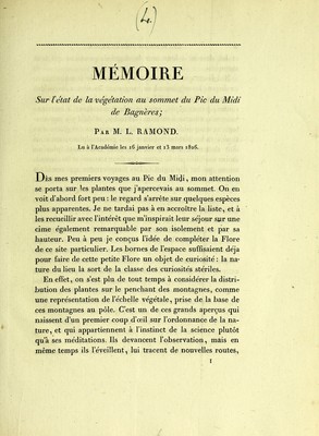 Mémoire sur l'état de la végétation au sommet du Pic du Midi de Bagnères / par L. Ramond.