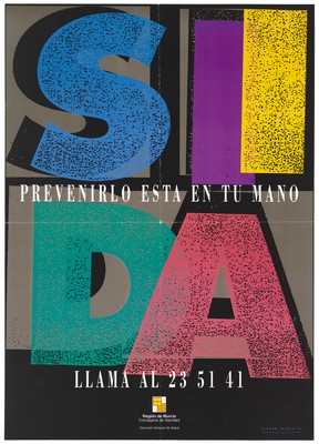 Credit: The word SIDA in bold colours with the message 'prevention is in your hands' representing an advertisement for an AIDS helpline by the Région de Murcia Consejería de Sanidad. Colour lithograph by Erudio, 1991. Source: Wellcome Collection.