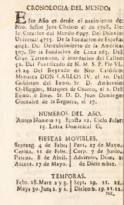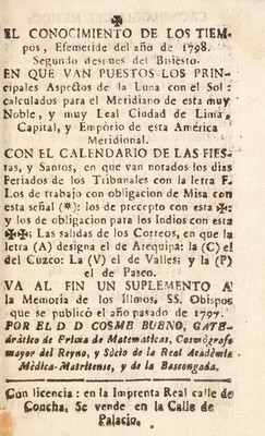 El conocimiento de los tiempos, efeméride del año de 1798. Segundo despues del bisiesto. En que van puestos los principales aspectos de la luna con el sol: calculados para el meridiano de ... Lima ... Va al fin un suplemento a la memoria de los ... Obispos que se publicó el año pasado de 1797 [&c.] / [Cosme Bueno].