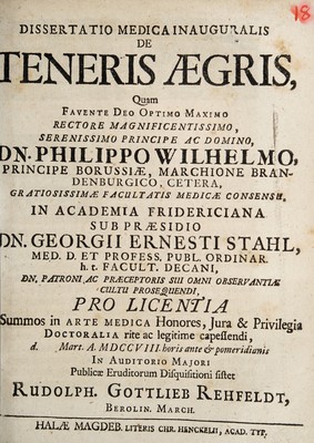 Credit: Dissertatio medica inauguralis de teneris aegris / [Rudolf Gottlieb Rehfeldt]. Source: Wellcome Collection.