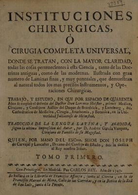 Instituciones chirurgicas, ó cirugia completa universal : donde se tratan ... todas las cosas pertenecientes á esta ciencia / Traducida de la lengua latina, y añadida, segun la ultima impression del autor, por D.A. Garcia Vazquez.