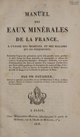 Manuel des eaux minérales de la France a l̕usage des médecins, et des malades qui les fréquentent ; contenant l̕exposé des précautions qu̕on doit prendre avant, pendant et apres l̕usage des eaux minérales, la topographie, le tableau des sources ; les propriétés physiques, chimiques, médicales, et le mode d'administration des eaux, la manière d̕en composer d̕artificielles, une notice bibliographique, la description des sources de spa, d̕Aix-la-Chapelle, d̕Aix en Savoie, de Louesche et de Saint-Gervais, précédé du Rapport de la Faculté de Médecine de Paris / [by Vauquelin and Geoffroy] Par Ph. Patissier. Public Domain Mark. Source: Wellcome Collection.