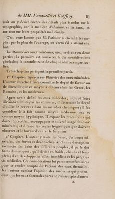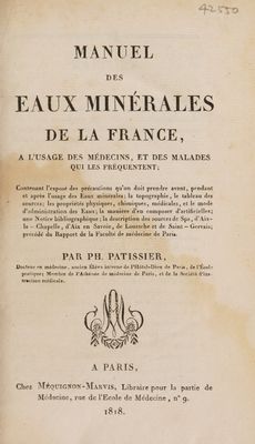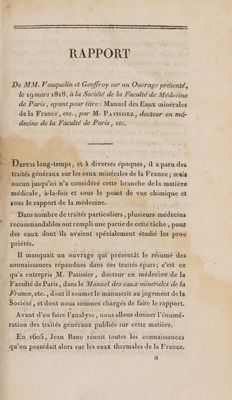 Manuel des eaux minérales de la France a l̕usage des médecins, et des malades qui les fréquentent ; contenant l̕exposé des précautions qu̕on doit prendre avant, pendant et apres l̕usage des eaux minérales, la topographie, le tableau des sources ; les propriétés physiques, chimiques, médicales, et le mode d'administration des eaux, la manière d̕en composer d̕artificielles, une notice bibliographique, la description des sources de spa, d̕Aix-la-Chapelle, d̕Aix en Savoie, de Louesche et de Saint-Gervais, précédé du Rapport de la Faculté de Médecine de Paris / [by Vauquelin and Geoffroy] Par Ph. Patissier.