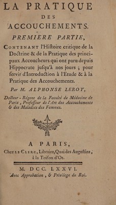 La pratique des accouchements. Première partie, contenant l'histoire critique de la doctrine et de la pratique des principaux accouchers ... jusqu'à nos jours / [Alphonse Vincent Louis Antoine Leroy].