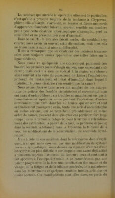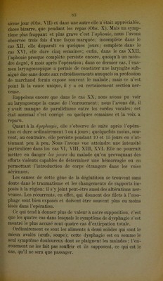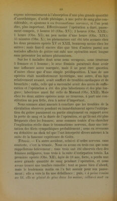 ![8S €xi)OSG iiéccssairejuent à l’absor])tioii d’iiiie plus grande quantité d’anesthésique, d’acide pliénique, à une j)erte de sang plus con- sidérable, et ajoutons h mi tramnatisme uerrenx, si l’on ])eut dire, plus important. Eliectivenient roi)ération a duré, ])anse- ment compris, 2 heures 10 (Obs. XY); 2 heures (Obs. XXll); 1 heure (Obs. XI); un ])eu moins d’une heure (Obs. XIX); .5.0 minutes (Obs. X); les ])hénomènes ont été très accusés chez les deux premiers opérés XV et XXII, beaucoup moins chez les autres; mais faut-il encore dire que bien d’autres parmi nos malades aftèctés de goitre ont subi une oi>ération aussi longue sans présenter les mêmes phénomènes. Sur les G malades dont nous nous occupons, nous trouvons 5 femmes et 1 homme ; le sexe féminin paraîtrait donc avoir une influence assez marquée, mais il ne peut être question d’autre chose que d’une simple prédisposition. L’une de nos opérées était manifestement hystérique, une autre, d’un âge relativement avancé, avait souffert de troubles cardiaques et de bronchite ; enfin, celle qui a succombé avait des accès de suffo- cation et l’opération a été des plus laborieuses et des plus lon- gues ; laborieuse aussi fut celle de Morand (Obs. XXII). Mais chez les deux autres opérées nous ne trouvons, à ])art une con- stitution un peu frêle, rien à noter d’important. Nous sommes ainsi amenés à conclure que les troubles de la circulation observés pendant ou immédiatement après l’extirpa- tion du goitre paraissent en partie simplement en rapport avec la perte de sang et la durée de l’opération, et qu’ils ont été plus fréquents chez les femmes ; nous sommes tentés d’en chercher l’exi)lication réelle dans le traumatisme nerveux, dans une irri- tation des filets sympathiques probablement ; nous en revenons en définitive au sbok tel que l’ont interprété divers auteurs à la suite de la fameuse expérience de Goltz. Tétanie. — Un autre accident, celui-ci d’ordre nerveux sans conteste, c’est la tétanie. Nous en avons eu trois cas que nous ra})pellerons brièvement ; tous trois ont été observés chez des femmes nullipares, tous trois à la suite d’extirpation totale. La première opérée (Obs. XII), âgée de 18 ans, forte, a perdu une assez grande quantité de sang pendant l’opération, et nous avons trouvé une trachée ramollie; tout se passe bien d’abord, mais le lendemain matin on l’a fait asseoir pour son panse- ment ; elle a vers la fin une défaillance ; puis, « à peine remise an lit, elle se plaint de gène dans les mains; celles-ci sont en](https://iiif.wellcomecollection.org/image/b22362897_0092.jp2/full/800%2C/0/default.jpg)
