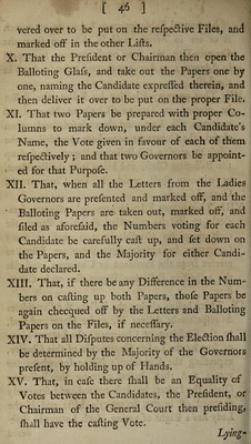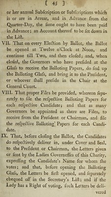 ![t 4s ] - ;n who fhall be hereafter difcharged, fhall be re-ad¬ mitted on any account whatfoever. That every Servant be acquainted on their Ad- miffion, that they are to do any Bufinefs that the Neceffity of the Charity requires, though not in the particular Station for which they are hired: That neither the Porter, nor any other of the Ser¬ vants, do prefume to go out of the Hofpital, with' out firft aiking Leave of the Matron. That all the Laws, Orders, and Regulations of the Hofpital be ftridtly obeyed and performed ; and that the fame be not altered in any Refpeft, but by the Direction of a Quarterly General Court, or by a Special General Court called for that Purpofe. That all the Laws, Orders, and Regulations be read once a Year at leaf!:, and particularly at the firft General Quarterly Court to be held after Chrijhnas.](https://iiif.wellcomecollection.org/image/b30792356_0052.jp2/full/800%2C/0/default.jpg)