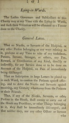Credit: The laws, orders, and regulations of the British Lying-in Hospital, for the reception of lying-in married women / collected together, revised, enlarged, and digested under proper heads, by the Weekly Committee, in pursuance of an order of the Quarterly General Court. Source: Wellcome Collection.