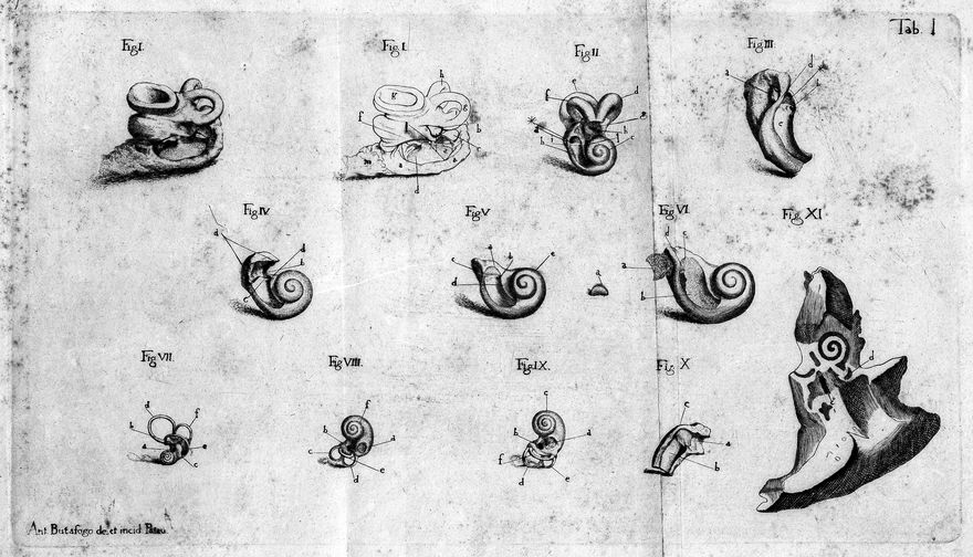 Credit: M0017235: Scarpa: <i>De structura fenestrae rotuundae</i>, 1772: plate I. Source: Wellcome Collection.