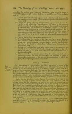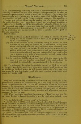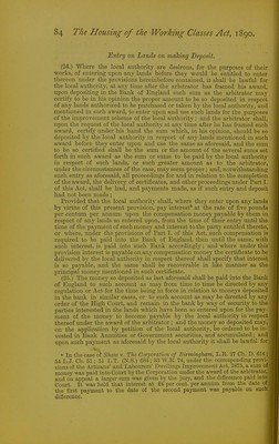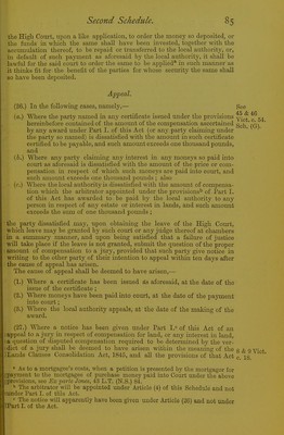 ![(19.) In every case in which any moneys are paid by any local authority under this Act for such compensation as aforesaid, the party receiving such moneys shall give to the local authority a receipt for the same, and such receipt shall have the effect of a grant, release, and conveyance of all the estate and interest of such party, and of all parties clauning under or through him, in the lands in respect of which such moneys are paid, pro- vided such receipt has an ad valorem stamp of the same amount impressed thereon in respect of the purchase moneys mentioned in such certificate as would have been necessary if such receipt had been an actual conveyance of such estate or interest, every such receipt to be prepared by and at the cost of the local authority. (20.) If it appear to the local authority, fi'om any such statement and abstract as aforesaid, or otherwise, that the person making any such claim ■ as aforesaid is not absolutely entitled to the lands, estate, or interest in respect of which his claim is made, or is under any disability, or if the title 1 to such lands, estate, or interest be not satisfactorily deduced to the local ; authority, then and in every such case the amount to be paid by the local ; authority in respect of such lands, estate, or interest as aforesaid shall be ■ paid and apphed as provided by the clauses of the Lands Clauses Con- r sohdation Act, 1845, as amended by the Com-t of Chancery Funds Act, 1872, 'with respect to the pm'chase money or compensation coming to parties ' ha\Tng limited interests, or prevented fi'om treating, or not making title. (21.) Where any person claiming any right or interest in any lands refuses ! to produce his title to the same, or where the local authority have under the ] provisions of Part I. of this Act taken possession of any lands in respect of ithe compensation whereof, or of any estate or interest wherein, no claim has ibeen made within one year from the time of the local authority taking ' ^possession, or if any party to whom any such certificate has been given or (tendered refuses to receive such certificate, or to accept the amount therein sspecified as payable to him, then and in any such case the amount payable bby the local authority in respect of such lands, estate, or interest, or the iamount specified in such certificate, shall be paid into the Bank of England, ian maimer provided by the last-mentioned clauses of the Lands Clauses Con- (olidation Act, 1845, as amended by the Com-t of Chancery Funds Act, 1872, land the amount so paid into the said Bank shall be accordingly dealt with uvs by the said Act provided. (22.) Nothing herein contained shall prevent the local authority from Tequiring any further abstract or evidence of title respecting any lands ancluded in any such award as aforesaid, in addition to the abstract or state- nnent hereinbefore mentioned, if they think fit, 0 as the same be obtained ,tt the cost of the local authority. (23.) If firom any reason whatever the local authority does not deliver the eertificate aforesaid to any party claiming to be entitled to any interest in my lands the possession whereof has been taken by the local authority as Iforesaid, then the right to have a certificate according to the provisions of HUB Act may, at the cost and charge of the local authority, be enforced by my party or parties, by application to the High Com't, in a summary way \y petition, and aU other rights and interests of any party or parties arising under the provisions of this Act may be in like manner enforced against the local authority by such application as aforesaid. '' See Sections 69 to 80 of the Lands Clauses Consolidation Act, 1845, in pppendix A, pages 118 to 123, and the notes thereon. G 2](https://iiif.wellcomecollection.org/image/b2440147x_0103.jp2/full/800%2C/0/default.jpg)