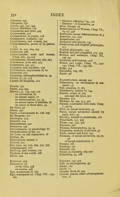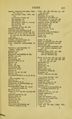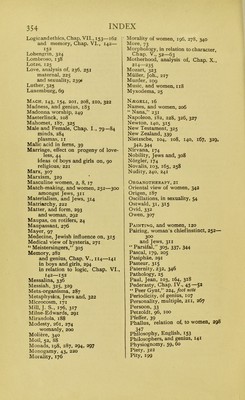 ![I V] , INDEX ^Esthetics and Erotics, Chap. XI., 236-251 Affinity, sexual, compared with che- mical, 41 Ahriman, 183 Alcmaeon, of Kroton, 81 Alexander the Great, 229 Amphibia, hermaphroditism, 22 Anaesthesia, sexual, 274 Anatomical distinctions of the sexes,3 Anatomy, as guide to sexuality, 3, 4 Animals, women and the sexual union of, 257 Angelo, M., 105 Anti-Christ, 183 Antisemitism, 303, 304, 312, 313 Apprehension, 116 Architecture, 119 Aristotle, 18, 140, 187, 293 Arrhenoplasm, Chap. II., 11-25 Aryans, 302 Asceticism, 329, 336, 347 Attraction, between the sexes, 26, 27 Autobiography, 122 Avenarius, 31, 82, 94, 100, 128, 144, 322 Bach, 103, 323 Bachelors, and women, 258 Bacon, 182 Bashkirtseff, Marie, 69 Bateson, on dimorphic earwigs, 34 Beatrice, 240, 336 Beauty, analysis of, 240, 242 Beethoven, 96, 112, 317 Bentham, 176, 317 Berkeley, 141,317 Bisexuality, oscillations in, 55 Bischoff, 12, 217 Bjornson, 108 Blavatsky, Mdme., 68 Blindness, colour, no Blood, transfusion of, 20 Bolsche, 329 Bonheur, Rosa, 68 Bonnet, 143 Boys and girls, education of, 58 Breeding, application of laws of sexual attraction to, 43 Breuer, on hysteria, 265, 269, 270 Bridgman, Laura, 66 Briinnhilde, 223 Bruno, 141, 240, 316 Buchner, 315 Buddha, 325, 328 Burchhardt, 72 Burns, Robert, 317 Byron, Lord, 236 C-ffiSAR, I34, 229, 230, 326 Carlyle, 113, 136, 140, 175, 229, 307, 3i7 Castration, effect of, 18 Catharsis, 269 Catherine II. of Russia, 66 Catholic view of marriage, 221 Catholicism and women, 207 Cattle, homosexuality in, 49 Causality, invented by man, 279 Cells, sexuality of, 15, 17, 22, 23 Ceres, 224 Chamberlain on Jews, 312, 321, 323, 328 on origin of Christianity, 328 ** Character ” of Avenarius, 94, 95, 96 Characteriology, Chap. V., 52-63 Characters, classification of, 14 secondary sexual, 43 Chastity, 331, 332, 334, 335.341, 34^ Chemistry, Kepler’s estimate of, 315 Chemotropism, 39, 41 Child, relation of mother and prosti- tute to, 219 Chinese, 187, 302 Chivalry, 204 Chopin, 67 Christ, 313, 325, 329 . Christianity and Judaism, 325, 327, 328 Clairvoyance, 277 Classification, 97](https://iiif.wellcomecollection.org/image/b21523587_0389.jp2/full/800%2C/0/default.jpg)