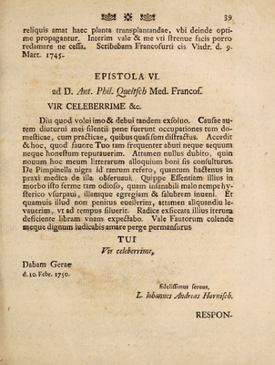 Credit: Meditationes botanico-medicae de planta quadam Marchiae propria Pimpinella nigra, quibus demonstratur, illam in multis morbis insignem possidere virtutem et efficiam / [Johann Andreas Harnisch]. Source: Wellcome Collection.