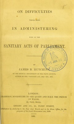 On difficulties which exist in administering some of the Sanitary Acts of Parliament / by James B. Hutchins.