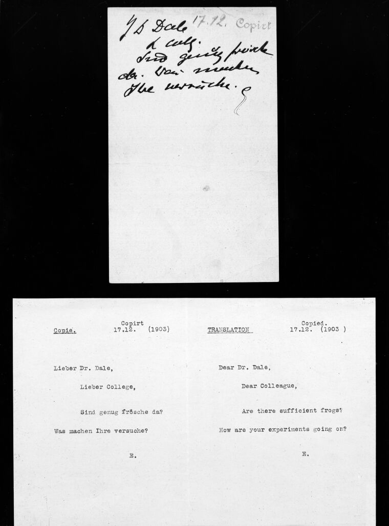 M0013919: Instruction from Paul Ehrlich to Henry Dale, 17 December 1903. In copyright. Source: Wellcome Collection.