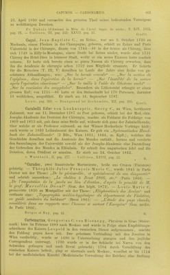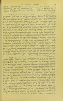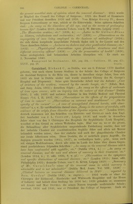 ![CAELISLE — CARMICHAEL. the preseiU vnsctfled State of opinion ahoit,t tlie venereal diseases. 1815 wurde er ^fitgliecl des Couneil des College of Snrgeons, 1825 de« Board of ExaminerH und war Präsident desselben 1826 nnd 1838. Vom Könige Georg IV., dessen Suvgeon Extraordiuary er war, erhielt er die Rittcrwflrde. Seine späteren Schriften sind: „An essai/ oii. the disorders of old age, and on tJie means of prolongiiuj human Ufe (London 1818 ; deutsehe Uebers. von G. W, Becker, Leipzig 1820) — „The Hunterian oration; etc. (1826, 4.) — „Letter to Sir Gilbert Blane an blisters, rubefacients and. escharotics; etc (1826) — „Observations on the im/propriety of men being employed in the business of midwifery (1824); die sich daran knüpfende ausgedehnte Polemik findet sich in der Lancet und den Times desselben Jahres — „Lectures on cholera and other jyestilential dis-eases; etc. (■1832) — „Physiological observations upon glandulär structures and their different secerning ojfces (1838) — „On the pve.9e-ru«<'io?i of health (1838). Seine zoologischen und botanischen Arbeiten übergehen wir. Er starb am 2. November 1840. Beaiigrand bei Dechambre, Xll, pag. 594. — Oalliseu, III, pag. 471; XXVII, pag. 28. Gurlt. Carmicliael, Richard C, 7ai Dublin, war am 6. Februar 1779 daselbst geboren, trat nach einem kurzen Studium in der Schule des College of Surgeons als Assistant Surgeon in die Miliz ein, diente in derselben einige Jahre, Hess sich 1803 als Arzt in Dublin nieder und wurde zunächst Chirurg des St. George's Hospital and Dispensary. Seine ^'ste literarische Arbeit war ein Aufsatz: „Gase of stricture of the Urethra, removed by the caustic bougie, etc. (Edinb. Med. and Snrg. Joürn. 1805); derselben folgte: „An essay on the effects of carbonate of iron vpon Cancer, wifh an inqwiry into the nature of that disease (Dublin 1806; 2. edit. 1809) und mehrere Aufsätze in den Dublin Medical and Physical Essays (Vol. I, II, 1807, 08): „Observations on ihe effects of the preparations of iron in Cancer — „Observations on cataract and Strabismus — „On the Opacity of ihe Cornea — „A case of strangulated femoral ]i.ernia, icith obser- vations u. s. w. Er veröffentlichte darauf einen „Essay on the nature of scrofala, loith evidence of its origin from disorder of the digestive organs, etc. (London 1810; deutsch zusammen mit den Schriften von HENNlNa und Goodlad nach dem Engl, frei bearbeitet von J. L. Choulant, Leipzig 1818) und wurde in demselben Jahre einer von den 5 Chirurgen des Hospitals für Syphilitische (Lock Hospital), woselbst er den Grund zu seinem Weltruhm legte. Hier war es, wo er die grosse, die Behandlung aller Syphilitischen imigestaltende Entdeckung machte, dass nur der indurirte Chanker zur constitutionellen Syphilis führe und allein mit Mercnr behandelt werden müsse, dass der'einfache iind auch der phagedänische Chanker nur locale Affectionen seien. Diese Doctrin, die er mehrfach gegen Angriffe, die dagegen gemacht wurden (1815, 1837), zu vertheidigen hatte, geht,_ wenn auch mit einigen Modificationen, durch alle seine im Laufe der Jahre über diesen Gegen- stand geschriebenen folgenden Schriften : „An essay on the venereal diseases which have been confounded with syphilis, etc. (Dublin 1814, 4.) — „An essay on venereal diseases, and the itses and abuses of mercury in their treatment, etc. (London 1814, 4.; 2. edit. 1825, 8. w. pl.) — „Observations on the Symptoms and specific distinctions of venereal diseases, etc. (London 1815; Amer. edit. Philadelphia 1825 ; deutsche Uebers. von C. G. Kühn, Leipzig 1819) — „Summarij of Mr. GarmichaeVs views of the venereal cases in which mercury is admissible and is not admissible (Dublin Med. Journ. Vol. XHI, 1838) — „ Glinical lectures on venereal diseases delivered in 1840 .... reported hy Sam.. Gordon (Dublin 1842, w. engrav.). — 1816 wurde er einer der Chirurgen der Ptichmoud, Hardwicke und Whitworth Hospitäler und dfs House oflndustry und behielt diese Stellung bis 1836 bei; 1826 gründete er, zus^ammeu mit Adams und Mac Dowell die seinen Namen tragende mcdicinische Schule; zweimal, 1826 und 1846, war er Präsident des College of Surgeons. Auch als](https://iiif.wellcomecollection.org/image/b21463712_0001_0672.jp2/full/800%2C/0/default.jpg)