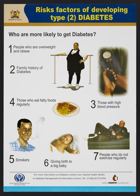 Credit: Risk factors of developing diabetes in Kenya. Colour lithograph by Ministry of Health, ca. 2000. Source: Wellcome Collection.