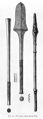 Credit: M0019301: Illustration of three wooden clubs, Fiji. Source: Wellcome Collection.