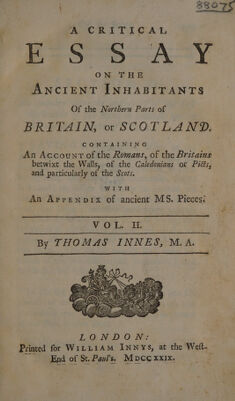 A critical essay on the ancient inhabitants of the northern parts of Britain, or Scotland. Containing an account of the Romans, of the Britains betwixt the walls, of the Caledonians or Picts, and particularly of the Scots. With an appendix of ancient MS. pieces / By Thomas Innes, M.A.