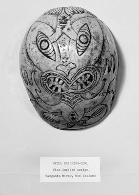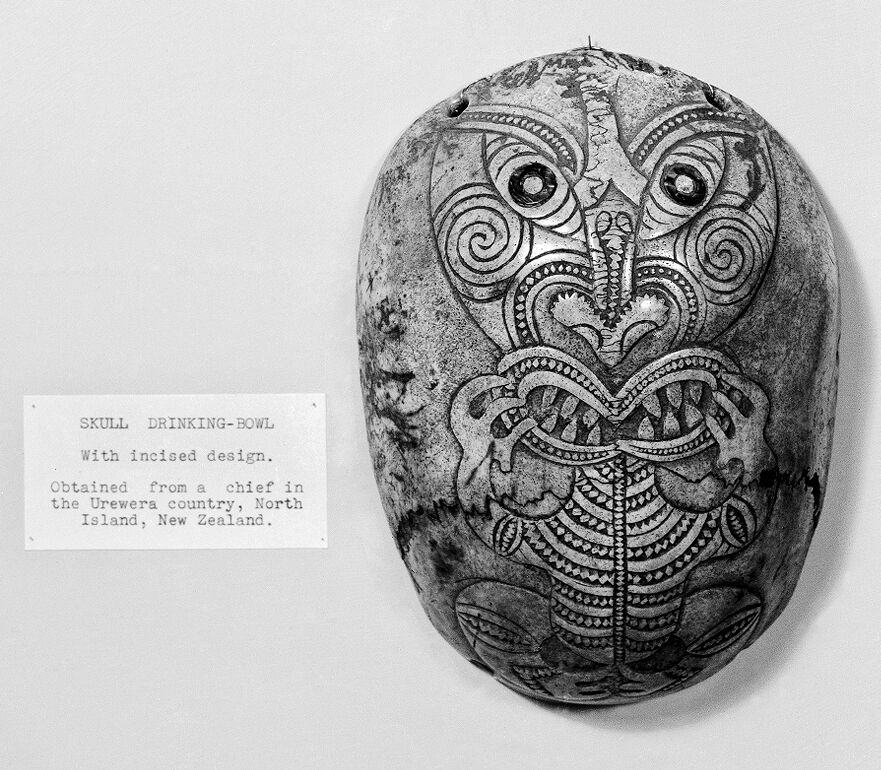 Credit: M0016035: Wellcome Historical Medical Museum display: a face mask from New Britain and two Maori drinking bowls made from human skulls. Source: Wellcome Collection.