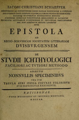 Iacobi Christiani Schaeffer serenissimi ac potentissimi regis Daniae Norwegiae a consiliis ... Epistola ad Regio-Borussicam Societatem Litterariam Duisburgensem : de studii ichthyologici faciliori ac tutiori methodo.