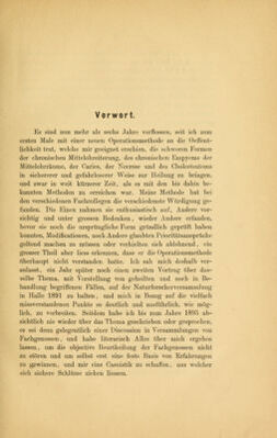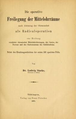 Die operative Freilegung der Mittelohrräume nach Ablösung der Ohrmuschel : als Radicaloperation zur Heilung veralteter chronischer Mittelohreiterungen, der Caries, der Necrose und des Cholesteatoms des Schläfenbeins. Nebst den Krankengeschichten der ersten 100 operirten Fälle.
