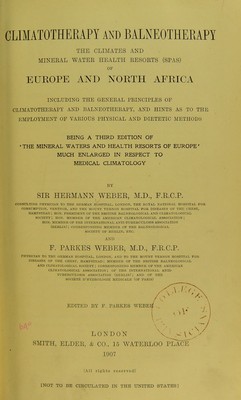 Climatotherapy and balneotherapy : the climates and mineral water health resorts (spas) of Europe and North Africa including the general principles of climatotherapy and balneotherapy, and hints as to the employment of various physical and dietetic methods / by Sir Hermann Weber and F. Parkes Weber ; edited by F. Parkes Weber.