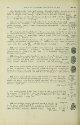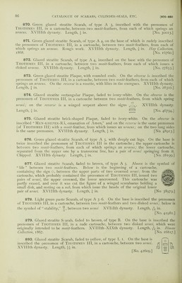![833. Glazed steatite Scarab, faded to yellow, of type A 3. On the base is the pre- nomen of Thotiimes III, in a cartouche, between two ?//rra/-feathers and two double volutes; from beneath the cartouche spring two human arms, out- stretched. XIXth dynasty. Length, § in. [No. 48800.] 834. Green glazed steatite Scarab, of type L 2, inscribed with the prenomen of Tiiotiimes III and two ///^-feathers. XVIIIth dynasty, or later. Length, § in. C2i Blacas Collection, 1867. [No. 16759.] 835. Green glazed steatite Scarab, partly faded to brown, of type A 3, inscribed with the prenomen of THOTHMES III between two inadt-feathers. Chipped. XVIIIth dynasty. Length, ^ in. [No. 46303.] 836. Glazed steatite Scarab, faded to white, of type A 3, inscribed with the prenomen of THOTHMES III between two w^Z-feathers. XVIIIth-XIXth dynasty. Length, \ in. [No. 46206.] 837. Blue-green glazed steatite Scarab, of type A 3, inscribed with the prenomen of THOTHMES III and two wrttf^-feathers, as before. XVIIIth dynasty. Length, \ in. [No. 28073.] 838. Glazed steatite Scarab, faded to grey, of type A 3, inscribed with the prenomen of Tiiotiimes III, with two maat-ie.athers, as before. Rough work. XVIIIth dynasty. Length, f in. [No. 42887.] 839. Blue faience Amulet, with the head of a Hathor cow, full face, in relief, on one side ; and, on the other, the prenomen of THOTHMES III, with two madt-kalhcrs. XVIIIth dynasty. Length, § in. Bnrgon Collection, 1842. [No. 4036.] 840. Green glazed steatite Scarab, of type A 3, inscribed with the prenomen of Tiiotiimes III, in a cartouche, between two madt-feathers and two neb-signs. XVIIIth dynasty. Length, in. [No. 41967.] 841. Green glazed steatite Scarab, of type A 3-6. On the base is inscribed the prenomen of Tiiothmes III, in a cartouche, between two ;«<ra/-feathers and two neb-signs, as before. Fine glaze. XVIIIth dynasty'. Length, § in. Anastasi Collection, 1839. [No. 3977.] 842. Green glazed steatite Scarab, of type A 3, inscribed as before. Length, J in. [No. 37757-] 843. Glazed steatite Scarab, of type A 3, inscribed with the prenomen of THOTHMES III, in a cartouche, between two madt-feathers and two ;/^-signs, as before. XVIIIth dynasty. Length, | in. [No. 27783.] 844. Light blue faience Scarab, of type L 2. On the base is inscribed the prenomen of Tiiotiimes III, in a cartouche, between two maat-feathers and two «^-signs, as before. XVIIIth dynasty. Length, \ in. [No. 27066.] 845. Blue paste Scarab, of type A 3-6. On the base is inscribed the prenomen of THOTHMES III, in a cartouche, between two madt-feathers and two «^-signs. XVIIIth dynasty. Length, \ in. Andrews Collection, 1848. [No. 3979.] 846. Green glazed steatite Scarab, of type A 3, inscribed with the prenomen of 1'HOTHMES III, between two madt-iea.\hers and two neb-signs, as before. XVIIIth dynasty. Length, | in. [No. 28322.] 847. Green glazed steatite Scarab, of tyrpe A 3. On the base is inscribed the prenomen of Tiiotiimes III, in a cartouche, between two maat-feaXhers and two «^-signs. XVIIIth dynast}'. Length, £ in. [No. 42016.] L 2](https://iiif.wellcomecollection.org/image/b2487582x_0127.jp2/full/800%2C/0/default.jpg)