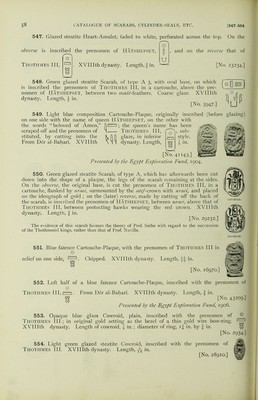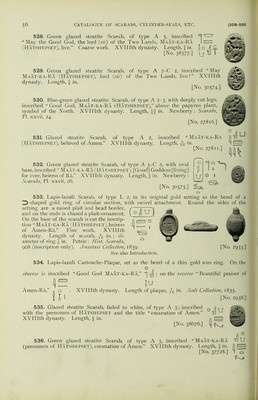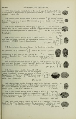 ![496. Green glazed steatite Scarab, of type A 3, with deeply cut legs and oval base, inscribed “ Hatshepset, beloved of Amen-Ra.” (The figure of the seated MflEB chief, sheps, is lion-headed.) Fine work and glaze. XVIIIth dynasty. Length, IggJfeJ fin. Newberry: Scarabs, PJ. xxviii, 36. [No. 29455.] ^6By 497. Blue-green glazed steatite Plaque, thin and roughly made. On the obverse is cut the prenomen of queen HATSHEPSET © (Maat-ka-Ra). On the other her name, <x 1] , Khnemt- ^ Jj Amen Hasheps. XVIIIth dynasty. ^ 1 I Length, fin. [No. 37725-] 498. Green glazed steatite Scarab, of type C 2, inscribed with the I prenomen of queen HATSHEPSET (Maat-ka-Ra). XVIIIth dynasty. „ ’ $ (\ Length. A in. ' [No. 40792-] U “ P 499. Glazed steatite Scarab, faded to white, of type C 2, inscribed with the prenomen of Hatshepset, J. XVIIIth dynasty. Length, f in. Loftie : Essay, Ixxxiv. [No. 24155.] 500. Glazed steatite Scarab, faded to yellow, of type C 2, with oval base, on I which is cut a hawk with outstretched wings, protecting a cartouche containing the | prenomen of Hatshepset. One side chipped. XVIIIth dynasty. Length, ^ in. [No. 33906.] 501. Glazed steatite Scarab, faded to white, of type A 2 3. On the base is inscribed the prenomen of HATSHEPSET, with the signs, “ Good God.” Roughly cut. XVIIIth dynasty. Length, \ in. [No. 46526.] 502. Green glazed steatite rectangular Plaque, inscribed on both sides with the prenomen of HATSHEPSET (Maat-ka-Ra), on the obverse between two obelisks (commemorating the erection of the great obelisks at Karnak I by the queen), and on the reverse between two ;«^rt/-feathers, and with the I symbols of “gold,” etc. XVIIIth dynasty. Length, f in. u [No. 41977. 503. Glazed steatite Scarab, faded to grey, of type A 3, with deeply cut legs, inscribed with the prenomen of queen HATSHEPSET, Khnem(t)-Amen (Maat-ka-Ra). XVIIIth dynasty. Length, f in. [No. 42046.] 504. Blue-green glazed steatite Cartouche-Plaque, inscribed on the obverse with the pre- || nomen of HATSHEPSET, ^ , and on the reverse, “ House of Amen, house of Uatchit.” Q fizif Lower end broken off. XVIIIth dynasty. Length, f in. [No. 27262.] 1 505. Green faience Cartouche-Plaque, inscribed on the. obverse with the prenomen of O cm I jj Hatshepset, ^ , and on the reverse “ House of Amen and Horus, house of Uatchi(t).” |j XVIIIth dynasty. Length 1^ in. [No. 32278.] QQ m 506. Blue faience Cartouche-Plaque, faded to white. On both sides is cut the prenomen of Hatshepset, with, in one case, two papyrus-sceptres. Chipped on one side. Mid XVIIIth dynasty. Length, f in. [No. 45367.] u](https://iiif.wellcomecollection.org/image/b2487582x_0097.jp2/full/800%2C/0/default.jpg)