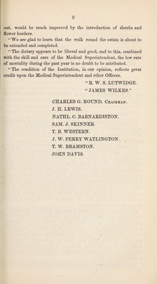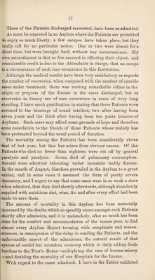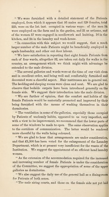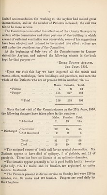![limited accommodation for washing at the Asylum had caused great i inconvenience, and as the number of Patients increased, the evil was : felt to be more serious. The Committee have called the attention of the County Surveyor to i certain of the dormitories and other portions of the building in which a want of sufficient ventilation was observable, some of his suggestions i have been adopted, and ordered to be carried into effect; others are | still under the consideration of the Committee. At the beginning of July two of the Commissioners in Lunacy i visited the Asylum, and entered the following minute in the book ' kept for that purpose “ Essex County Asylum, Bed July, 1857. “Upon our visit this day we have inspected all the wards and : rooms, offices, workshops, farm buildings, and premises, and seen the whole of the Patients who are at present 393 in number, viz. Males. Females. Total. “ Private ... . 4 8 12 “Pauper ... . 154 227 381 “Total ... . 158 235 393 ----- “ Since the last visit of the Commissioners on the 27th June, 1856, the following changes have taken place in the numbers : „ “Admitted ... Males. 61 Females. 73 Total. 134 „ , , c Recovered 29 25 54 “ Discharged ] (.Not Recovered « * « 2 2 4 Total ... 31 27 68 Died. 16 19 35 “ The assigned causes of death call for no special observation. Six Patients appear to have died of epilepsy, 7 of phthisis, and 11 of paralysis. There has been no disease of an epidemic character. “The inmates appear generally to be in good bodily health; twenty- eight only, viz. 11 males and 17 females, are registered as under medical treatment. “ The Patients present at divine service on Sunday last were 226 in number, viz., 99 males and 127 females. Prayers are read daily by the Chaplain.](https://iiif.wellcomecollection.org/image/b30307193_0007.jp2/full/800%2C/0/default.jpg)