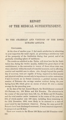 Report of the Committee of Visitors, report of the Medical Superintendent, and other papers relating to the asylum : printed by order of the Court of Quarter Session, January, 1858 / Essex Lunatic Asylum.