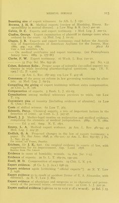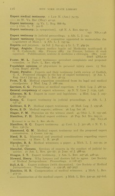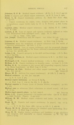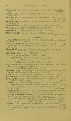![Wight, J. S. Suggestions to tlic medical witness. 228p. Camb. [Mass.l iSgr. 614,23 Pr Wight, O. W. What is expert testimony and who are experts? i Med. Leg. J. 140-57- Williams, H. S. Medical expert and the homicide. 164 N. A. Rev. 1(^0-72. 051 N8i,v.i64 Wollman, Henry. Physicians; expert witnesses; some reforms. 17 .Med. LcR. J. 20-37. Wood, E, E. S. Medical expert testimony. 7 Am. Lawy. 92-97. Wood, H. C. jr. Medical expert evidence, ir Lipp. 443-54. 051 L66,v.ii I'or criticism sec y West. J. 486-90; 7 Alb. L. J. 258-60. Woodson, I. T. Expert testimony. 3 Ky. L. R. 479-96. Woodward, John. Expert evidence. 175 N. A. Rev. 486-99. 051 N8i,v.i75 Hypnotism Alleged seduction through the influence of hypnotism [review of Austin v. Barker]. 30 N. Y. Law J. 1530. Bannister, H. M. Plea of hypnotism in criminal cases. 27 Chic. L. N. 182, SI Alb. L. J. 87-88; 29 Ir. L. T. 150-51; 30 L. J. 292-93; 98 Law T. 403-4- Beard, G. M. New theory of trance and its bearings upon human testi- mony, {see N. Y. Medico-legal Society. Papers. 3:315-62) Bell, Clark. Hypnotism. 7 Med. Leg. J. 363-71. (sec, his Medico-legal studies. 2: 124-32) • Hypnotism and the law. 8 Med. Leg. J. 331-58. ■ (see his Medico-legal studies. 3: 1-28) ■ 13 Med. Leg. J. 47-56; 16 Chic. L. J. 336-44- Hypnotism in the criminal courts. 18 Crim. L. M. 1-12; 13 Med. Leg. J. 351-62; 2 W. Va. Bar 194-95- (see his Medico-legal studies. 5: 1-12) Bramwell, J. M. Phenomena of hypnotism and the theories as to its nature [with discussion]. 16 Med. Leg. J. 244-50. Chapin, H. G. Eorensic aspect of hypnotism. 3 Am. Lawy. 534~38. Charcot, J. M. Hypnotism and crime. 9 Forum 159-68. 051 F77,v.9 Cocke, J. R. Dangers attending the practice of hypnotism, (see his Hypnotism. 1894. p. 46-62) 134 C64 Dailey, A. H. Hypnotic power, what is it? 13 Med. Leg. J. 274-78. Hypnotism in medico-legal jurisprudence. 11 Med. Leg. J. 261-74. Dawson, M. L. Hypnotism in its scientific and forensic aspects. 18 Arena 544-56. 051 Ar3,v.i8 Ellinger, Moritz. Case of [C. L.] Czynski [trial for inducing illegal rela- tions through hypnotism]. 14 Med. Leg. J. 150-62. Gilles de la Tourette, Georges. (L') hypnotismc ct les etats analogues au point de vue medico-legal, les etats hypnotiques et les etats ana- logues; les suggestions criniinellcs, cabinets de somnambules ct societes de magnetisme ct de spiritismc; I'hypnotisme devant la loi; preface de P. Brouardel . . . 534P- Pa'- i887- I34 G41 Hudson, T. J. Danger lines in hypnotism, (sec his Evolution of the soul. 1904. P- 257-72) 134 H861 Hypnotism and crime, (see his Law of psychic phenomena. 1893- p. 12^43) H86](https://iiif.wellcomecollection.org/image/b24750013_0126.jp2/full/800%2C/0/default.jpg)