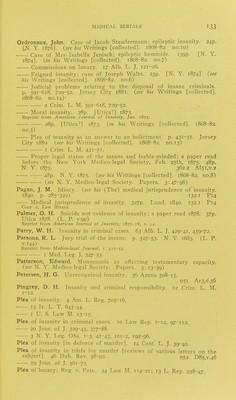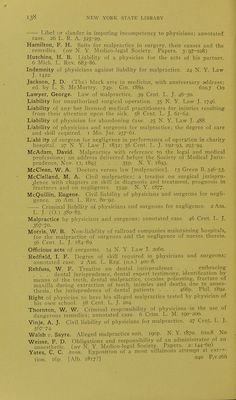 ![Libel or sUinrlcr in imputing incompetency to physicians; annotated case. 26 L. R. A. 325-29. Hamilton, F. H. Suits for malpractice in surgery, their causes and the remedies, (see N. Y. Medico-legal Society. Papers. 3:97-108) Hutchins, H. B. Liability of a physician for the acts of his partner. 6 Mich. L. Rev. 683-86. Indemnity of phj^sicians against liability for malpractice. 24 N. Y. Law J. T422. Jackson, J. D. (Tlie) black arts in medicine, with anniversary a<ddress; ed. by L. S. McMurtry. 74p. Cin. 1880. 610.7 Oo Lawyer, George. Law of malpractice. 39 Cent. L. J. 46-50. Liability for unauthorized surgical operation. 35 N. Y. Law J. 1746. Liability of any but licensed medical practitioners for injuries resulting from their attention upon the sick. 58 Cent. L. J. 61-62. Liability of physician for abandoning case. 25 N. Y. Law J. 488. Liability of physicians and surgeons for malpractice; the degree of care and skill required, i Mo. Jur. 257-61. Liabi ity of surgeon for negligence in performance of operation in charity hospital. 27 N. Y. Law J. 1832; 56 Cent. L. J. 192-93. 293-94. McAdam, David. Malpractice with reference to the legal and medical professions; an address delivered before the Society of Medical Juris- prudence, Nov. 13, 1893 . . . 35p. N. Y. 1893. McCIean, W. A. Doctors versus law [malpractice]. 13 Green B. 346-53. McClelland, M. A. Civil malpractice; a treatise on surgical jurispru- dence with chapters on skill in diagnosis and treatment, prognosis in fractures and on negligence. 554P- N. Y. 1877. McQuillin, Eugene. Civil liability of physicians and surgeons for negli- gence. 20 Am. L. Rev. 80-92. Criminal liability of physicians and surgeons for negligence. 2 Am. L. J. (O.) 380-85. ' Malpractice by physicians and surgeons; annotated case. 46 Cent. L. J. 367-70. Morris, W. B. Non-liability of railroad companies maintaining hospitals, for the malpractice of surgeons and the negligence of nurses therein. 56 Cent. L. J. 184-89. Officious acts of surgeons. 34 N. Y. Law J. 2060. Redfield, I. F. Degree of skill required in physicians and surgeons; annotated case. 2 Am. L. Reg. (n.s.) 400-8. Rehfuss, W. F. Treatise on dental jurisprudence . . . embracing . . . dental jurisprudence, dental expert testimony, identification by means of the teeth, dental malpractice, cocaine poisoning, fracture of maxilla during extraction of teeth, injuries and deaths^ due to anaes- thesia, the jurisprudence of dental patients . . . 468p. Phil. 1892. Right of physician to have his alleged malpractice tested by physician of his own school. 58 Cent. L. J. 204. Thornton, W. W. Criminal responsibility of physicians in the use of dangerous remedies; annotated case. 6 Criin. L. M. 190-200. Vinje, A, J. Civil liability of physicians for malpractice. 27 Cent. L. J. 567-74. Walsh V. Sayre. Alleged malpractice suit. igop. N. Y. 1S70. 610.8 No Weisse, F. D. Obligations and responsibility of an administrator of an anac-^tlietic. (.-rcf N. Y. Medico-legal Society. Papers. 2:144-60) Yates C C. nuon. Exposition of a most villainous attempt at extor- tion'. T6p. [Alb. i8r7?] P'^'^^^](https://iiif.wellcomecollection.org/image/b24750013_0144.jp2/full/800%2C/0/default.jpg)