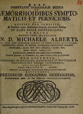 Credit: Dissertatio inauguralis medica de haemorrhoidibus symptomaticis et perniciosis ... / [Friedrich Rudolf Heidegger]. Source: Wellcome Collection.