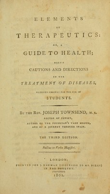 Elements of therapeutics, or, A guide to health : being cautions and directions in the treatment of diseases : designed chiefly for the use of students / by the Rev. Joseph Townsend.