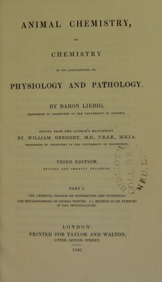 Animal chemistry, or, Chemistry in its applications to physiology and pathology : part 1 / by Baron Liebig; edited from the author's manuscript by William Gregory.