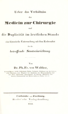 Ueber das Verhältniss der Medicin zur Chirurgie und die Duplicität im ärztlichen Stände. Eine historische Untersuchung mit dem Endresultat für die betreffende Staatseinrichtung / [Philipp Franz von Walther].