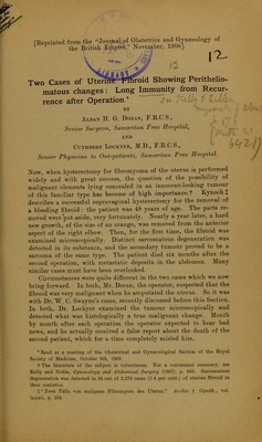 Two cases of uterine fibroid showing peritheliomatous changes : long immunity from recurrence after operation / by Alban H.G. Doran and Cuthbert Lockyer.